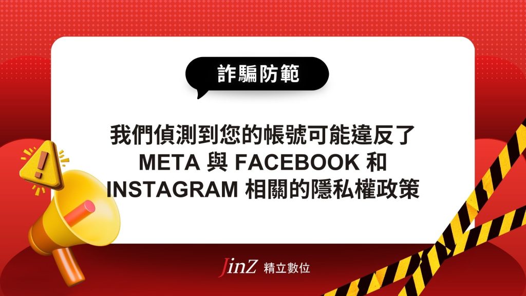 反詐騙專區, 最新消息, 詐騙防範【詐騙防範】我們偵測到您的帳號可能違反了 Meta 與 Facebook 和 Instagram 相關的隱私權政策 作者: 精立數位 / 2024/12/24 您是否收到「我們偵測到您的帳號可能違反了