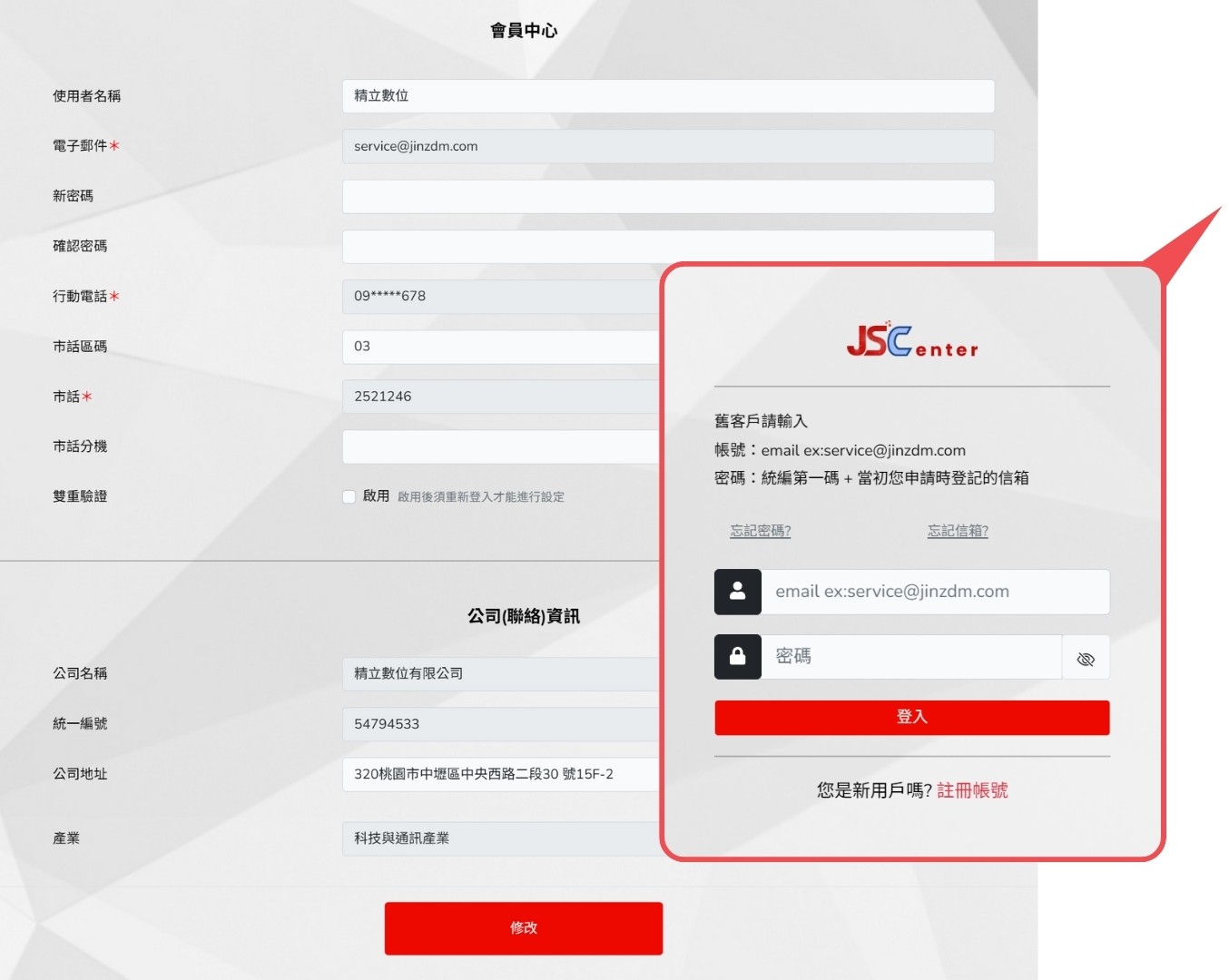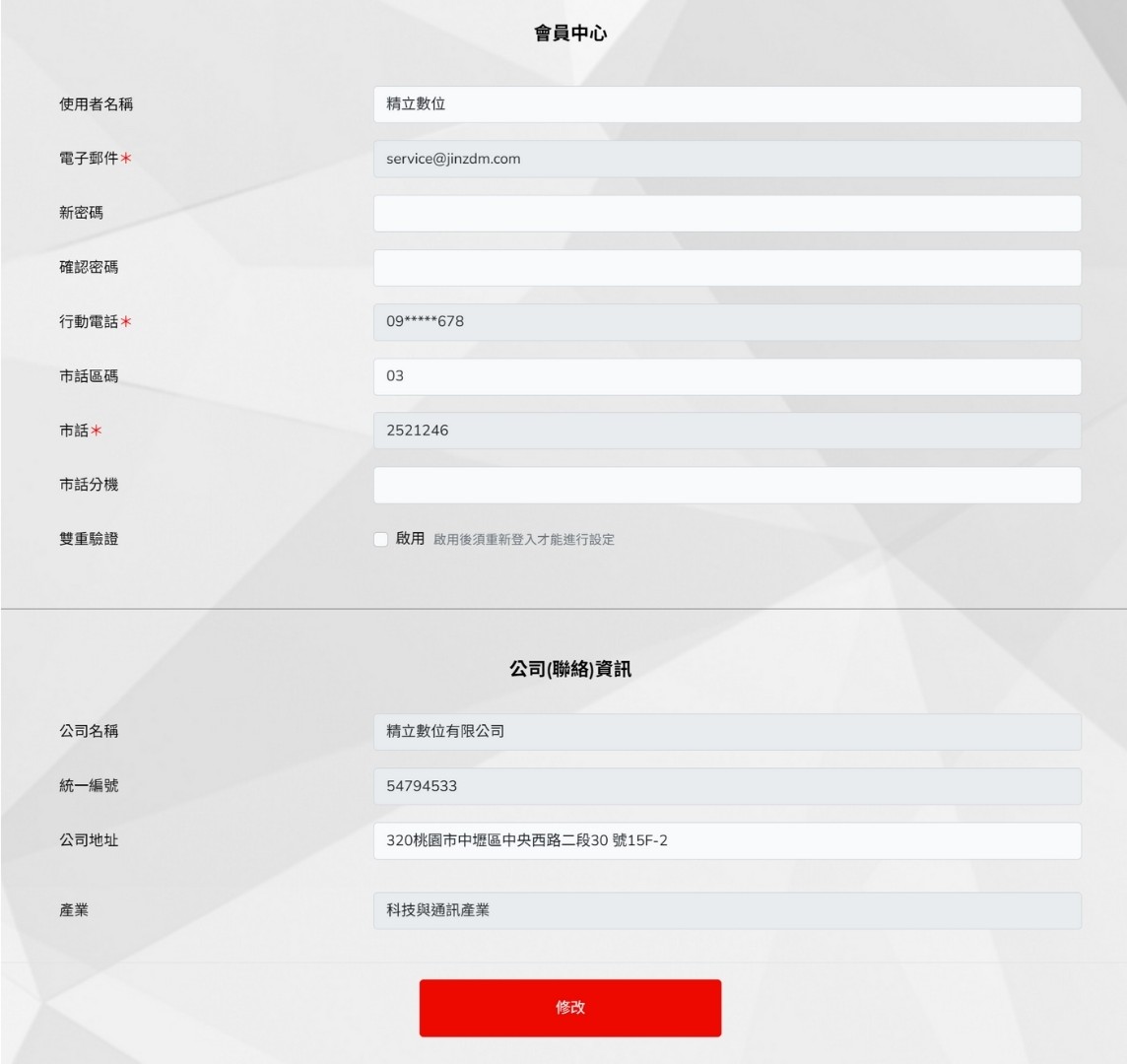 JS Center 提供完整的會員資料管理功能,使用者可隨時更新個人與公司相關資訊,確保帳號資料正確無誤,以利後續服務申請、廣告投放與系統通知順利進行。