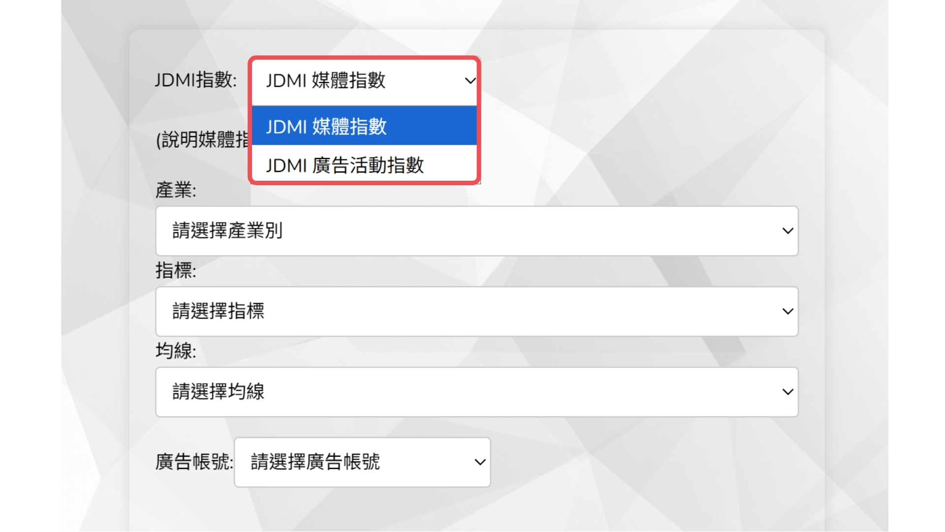 JDMI 指數為企業提供了一個強大且直觀的工具,幫助分析市場趨勢、優化廣告投放策略。通過簡單的操作,企業能夠快速獲得有價值的市場洞察,提升廣告效果並實現更高的市場競爭力。立即開始使用 JDMI 指數,讓您的廣告策略更加精確,為企業帶來更大的價值。