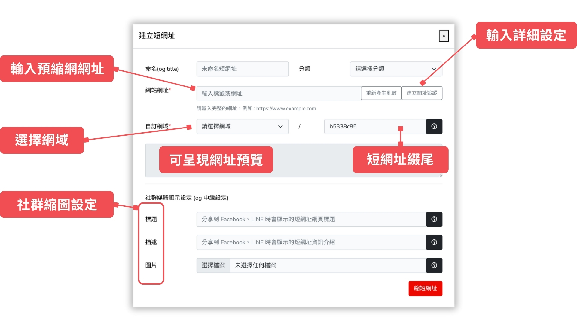 若您希望將短網址分享到社群平台,可以選擇設置社群縮圖、標題和描述,這些設定有助於提高點擊率和用戶互動。