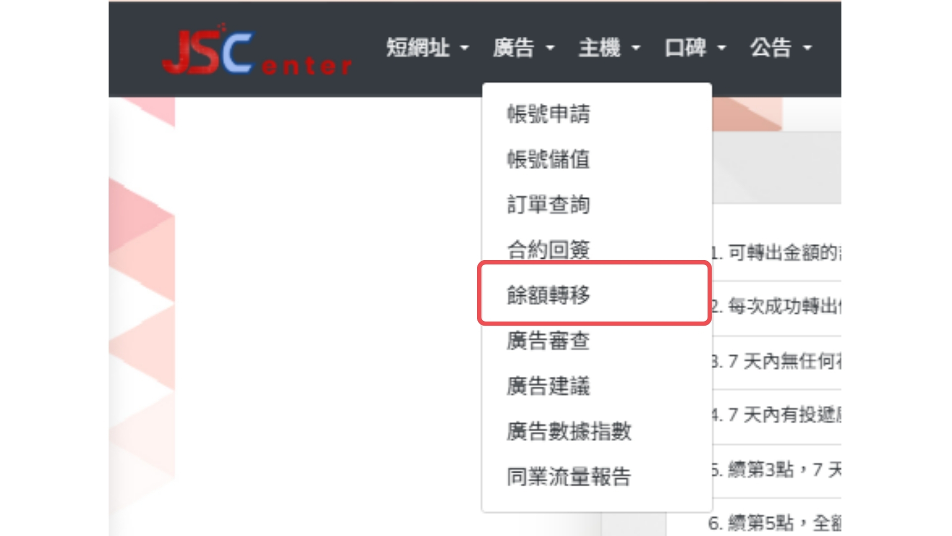 首先,您需要在主選單中選擇「廣告」選項,然後點選「餘額轉移」,此操作可以讓您進入轉移餘額的操作頁面。