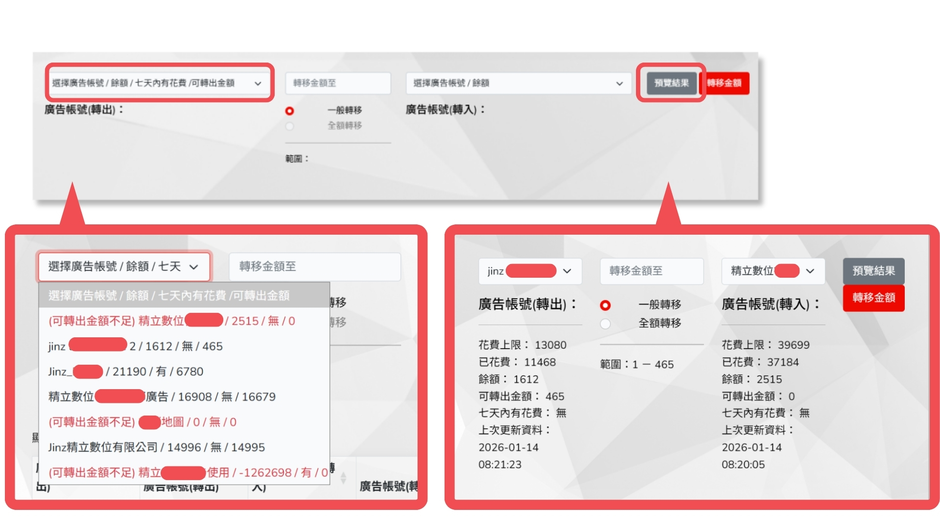.續第 3 點,全額轉移:會將轉出帳號的已花費清空轉至餘額,將花費上限重設為 1,並將原本帳號的餘額,增加到轉入帳號的花費上限。