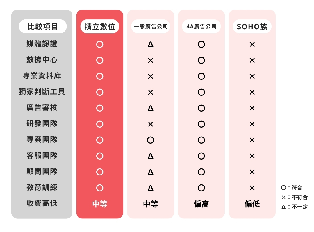 為了確保執行專員與客戶的資訊一致,我們會先進行廣告專案啟動會議,從現況分析、品牌策略、廣告規劃總覽到權限確認合作方式進行詳細的說明,並針對產品淡旺季規劃廣告策略,以及提供廣告預算與成效預估,讓客戶可以清楚了解此次合作預計帶來的效益。同時,我們也會針對素材文案設計、廣告素材格式、粉專文案等提供專業建議,讓您與精立數位合作安心又放心。