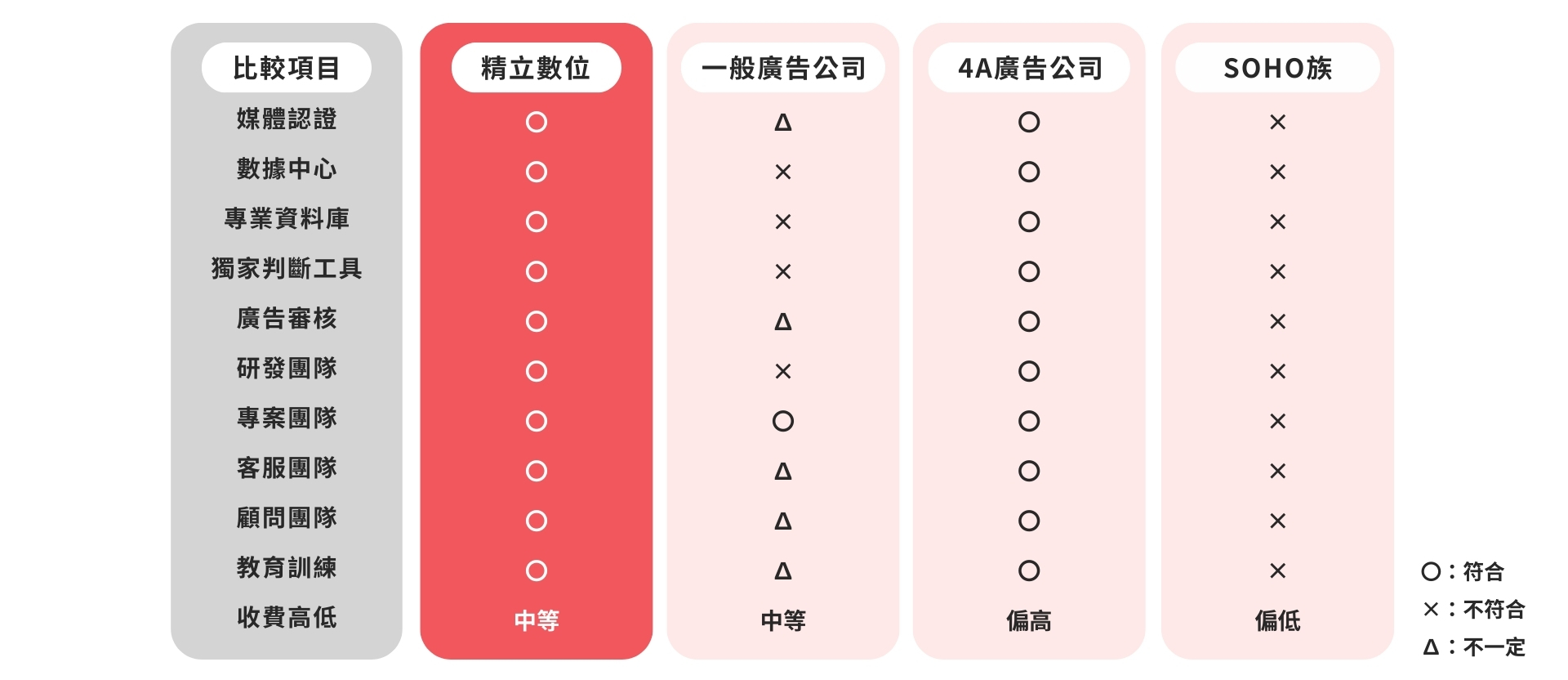 10+年成功經驗,深入掌握市場特性和趨勢,擁有豐富的數據資料庫,精確規劃預算、受眾設定及解決方案,為業主創造最佳效益。