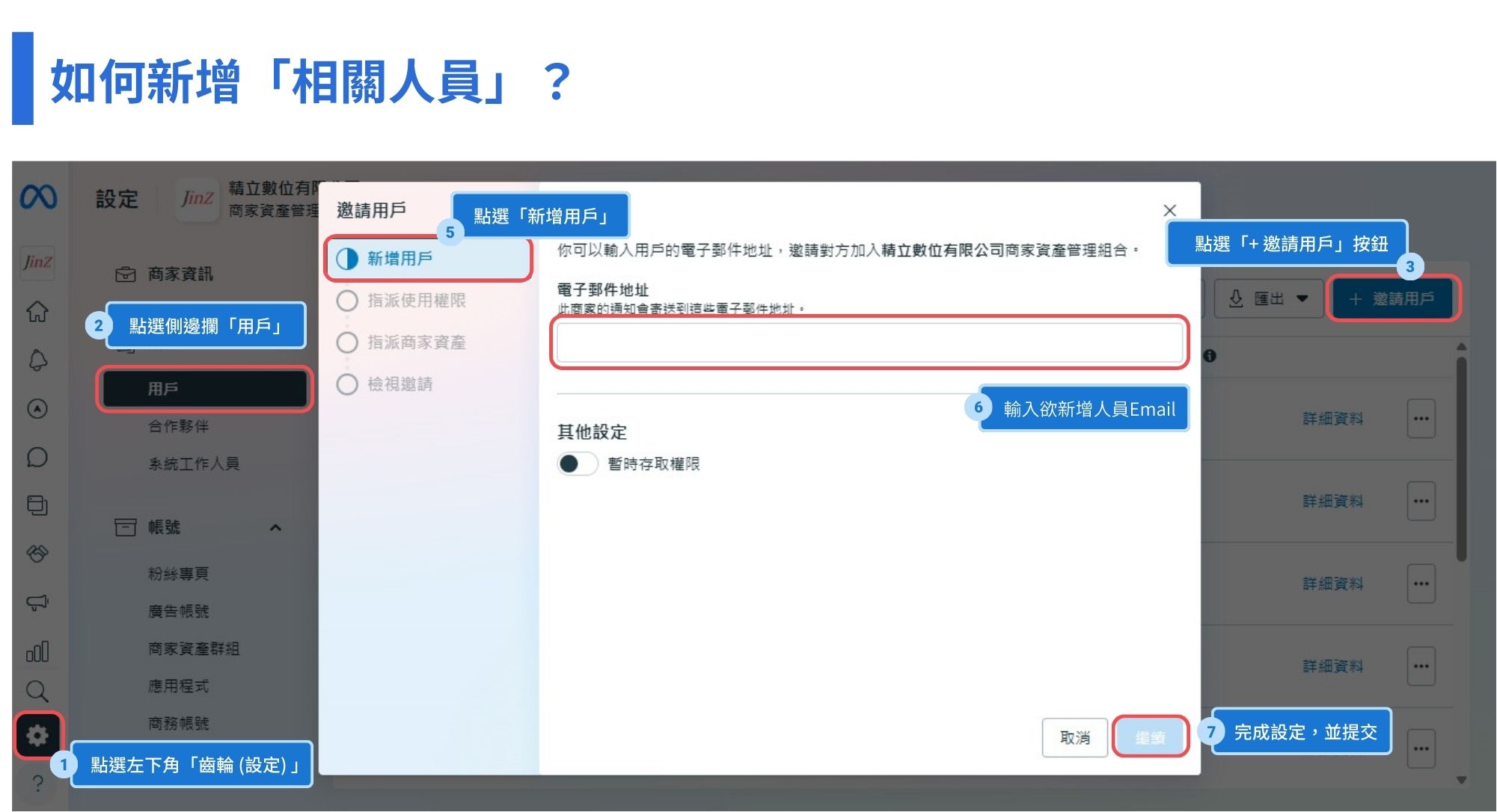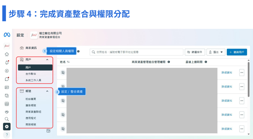 只要是需要操作粉絲專頁、廣告帳號或其他資產的人,都必須先被加入 BM 中,才能被分配權限。