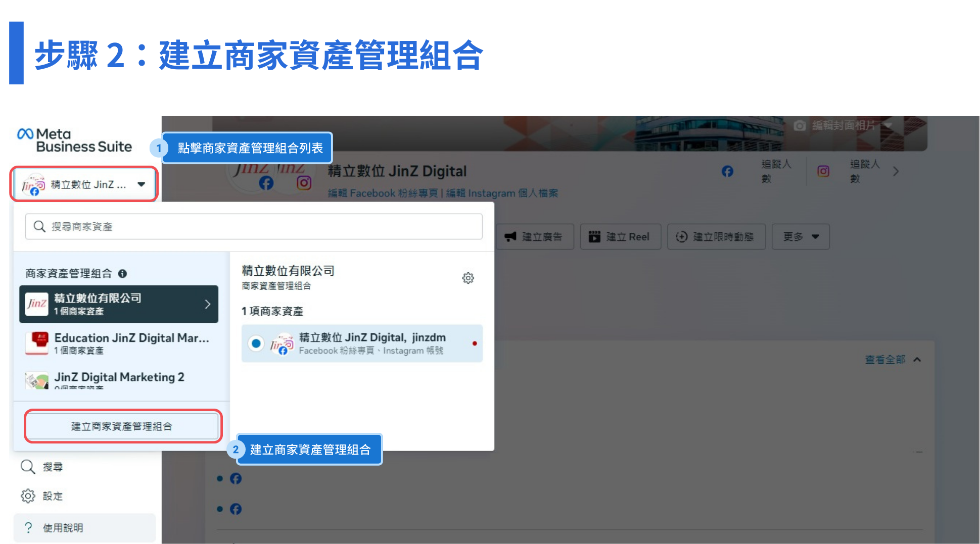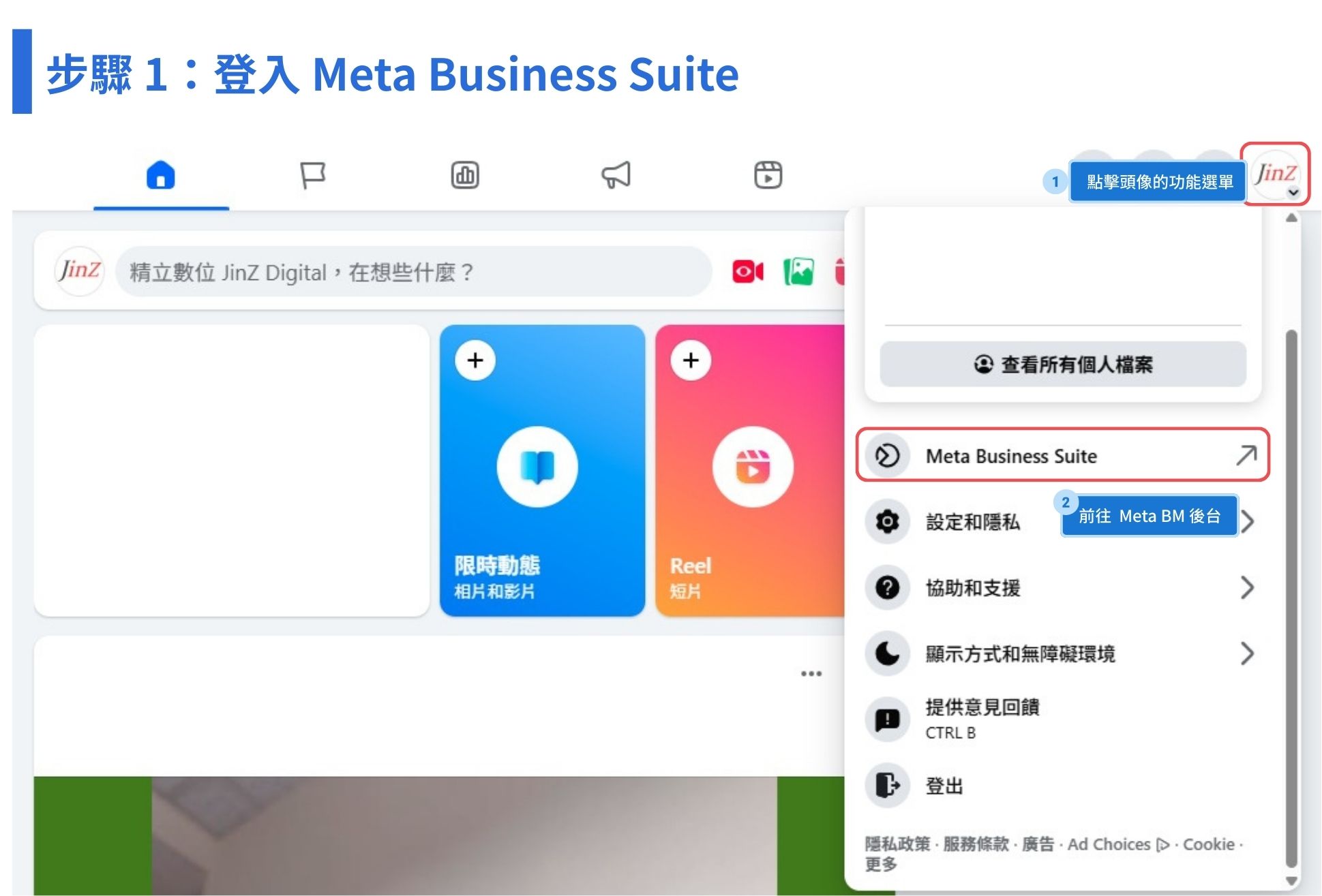 如果你的帳號已有 BM 的存取權,可點擊右上角頭像的下拉式功能表直接進入 Meta Business Suite。