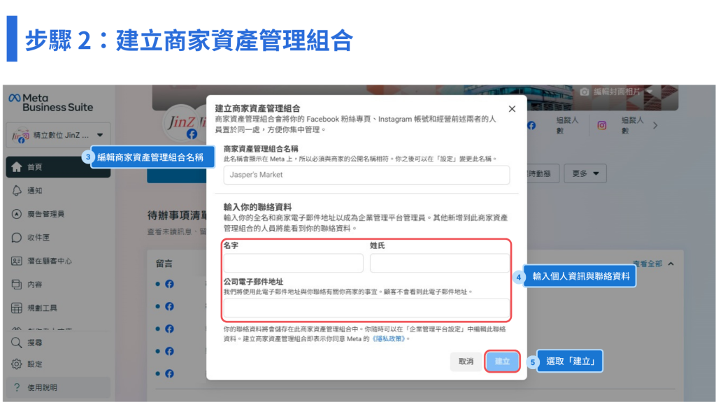 ➤ 填寫商家詳細資料:商家資產管理組合名稱 / 您的姓名 / 商家電子郵件地址 ( Meta 將使用此郵件與你聯絡 )