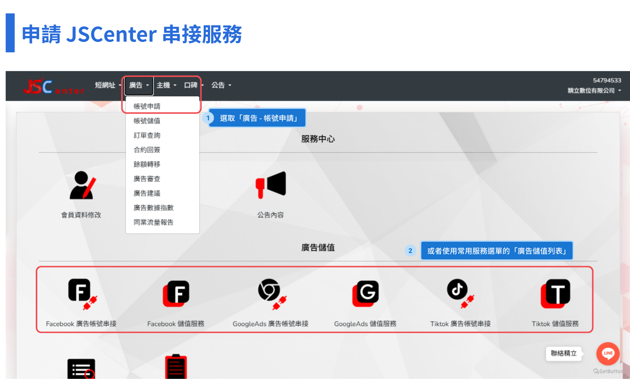 您只需提供 BM 編號,JS Center 系統就能快速辨識企業身份並完成串接,且支援 24 小時內快速完成廣告儲值入帳,