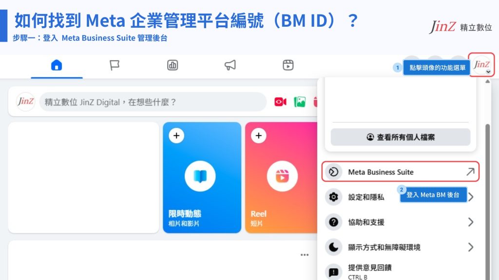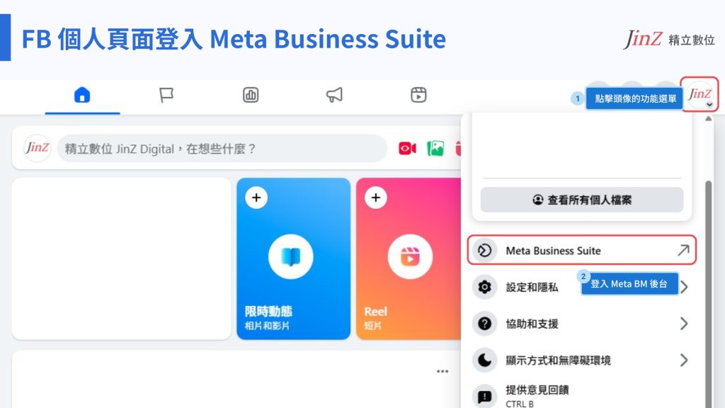 如何登入 Facebook ,點選頭像進入 Meta Business Suite(BM 後台)