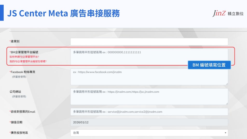 在使用 JS Center Meta 廣告串接服務時,系統會要求使用者提供 BM 的商家資產管理組合編號(BM ID),用來驗證企業身份,並確保 Facebook 廣告帳號與資產授權的安全性。