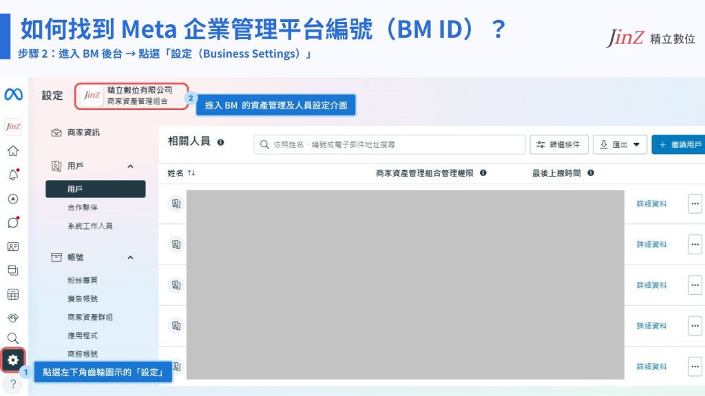 步驟 2:進入 BM 後台 → 點選「設定(Business Settings)」