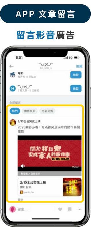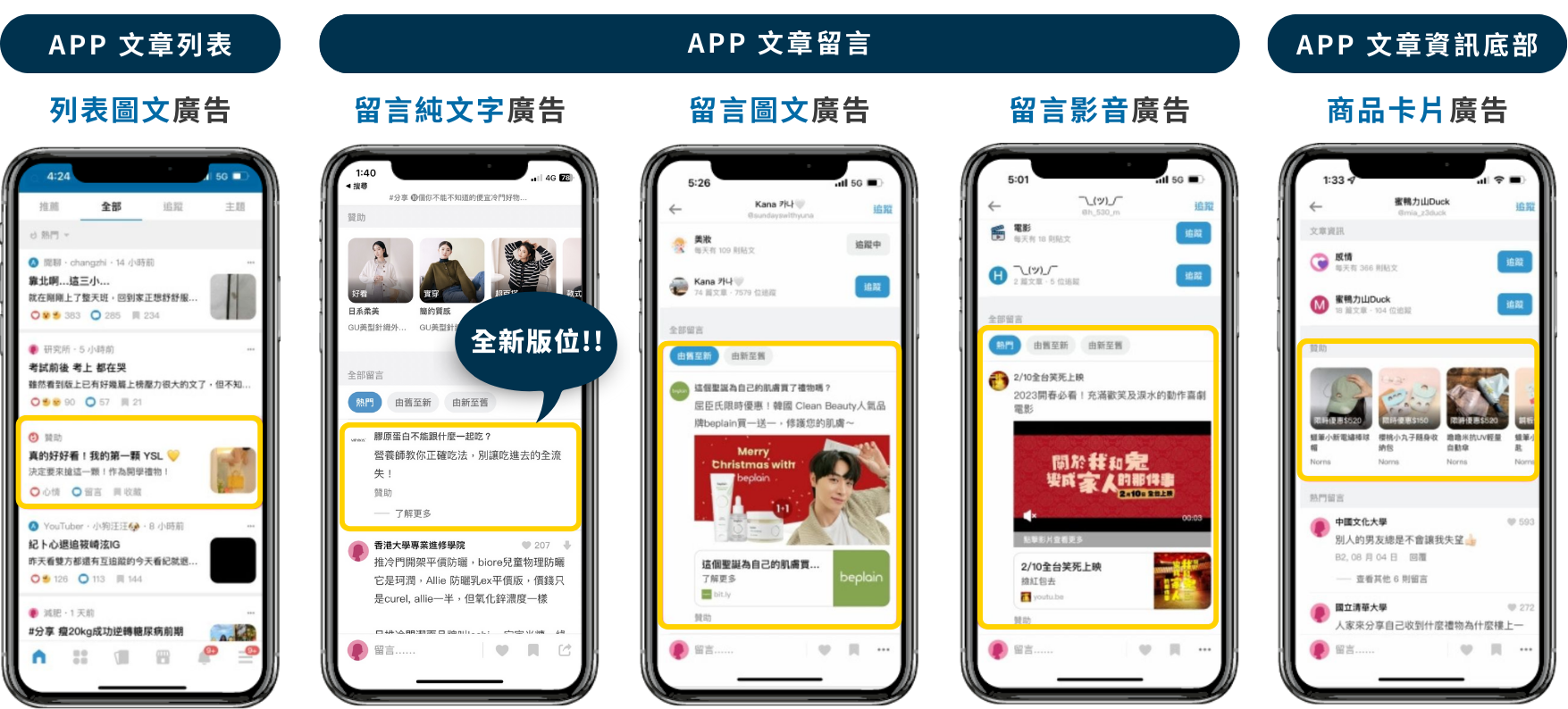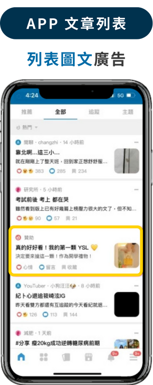 APP 原生廣告主要有兩種版位選擇,文章列表是曝光率最高的位置,做為品牌導流主要預算分配的版位。