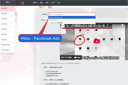 廣告帳號管理工具 JS Center「Meta 廣告帳號申請/儲值」功能,由精立數位協助開立廣告費用發票,發票開立、省申報費用,讓企業不再為境外稅與報帳問題煩惱。合法、安全、有效率!從帳號開立到儲值投放,一站式完成,讓行銷與財務管理都更順暢。 廣告帳號管理工具 JS Center「Meta 廣告帳號申請/儲值」功能,由精立數位協助開立廣告費用發票,發票開立、省申報費用,讓企業不再為境外稅與報帳問題煩惱。合法、安全、有效率!從帳號開立到儲值投放,一站式完成,讓行銷與財務管理都更順暢。 Meta 廣告帳號申請/儲值 精立數位的JS Center「Meta 廣告帳號申請/儲值」功能,提供清楚的步驟與操作指引,讓熟悉行銷後台的使用者也能輕鬆上手。透過精立數位帳戶申請,不僅能開立合法電子發票,更能免除境外付款與稅務申報的麻煩,讓投放更快速、帳務更安心。 功能特點 一、流程簡化,快速完成帳號開立與儲值 系統導覽清晰,步驟簡單明確,無需繁雜設定。只要填寫必要資料並完成審核,即可在 24 小時內啟用帳號。讓廣告主從帳號申請到投放開跑,一氣呵成,節省時間與溝通成本,專注於行銷策略的執行。 二、合法開立發票,免境外稅申報 精立數位作為本地合規代理,協所有 Meta 廣告儲值費用皆可開立台灣電子發票,有效降低財務申報成本,不僅安全合規,讓企業財報管理更透明、清晰,更徹底告別境外稅的繁瑣與不確定性。 三、帳號安全性提升,避免拒登與停用 JS Center協助Meta廣告帳號申請與串接,採用官方認證與安全授權流程,確保投放環境穩定安全。降低因操作錯誤或異常金流導致的廣告拒登、帳號停用風險,讓廣告投放更順暢、穩定不中斷。 四、廣告儲值快速,一天內即可入帳 精立數位提供快速入帳機制,廣告儲值完成後,二十四小時內即可入帳!不僅讓行銷活動能即時啟動,也能更彈性地規劃投放節奏,確保每一分預算都能在關鍵時刻發揮最大效益。 簡易操作方法 Step 1在選單列上,點選「廣告」 Step 2在下拉式選單上,選擇「帳號申請」 Step 3在媒體類型選項中,選擇「Meta - Facebook Ads」 Step 4填寫下方申請表單,將在營業時間30分鐘內寄出合約書及匯款資訊 Step 5專員在24小時內開立廣告帳戶並儲值金額,並在七天內(不含例假日)寄出發票 立即使用精立數位的JS Center JS Center