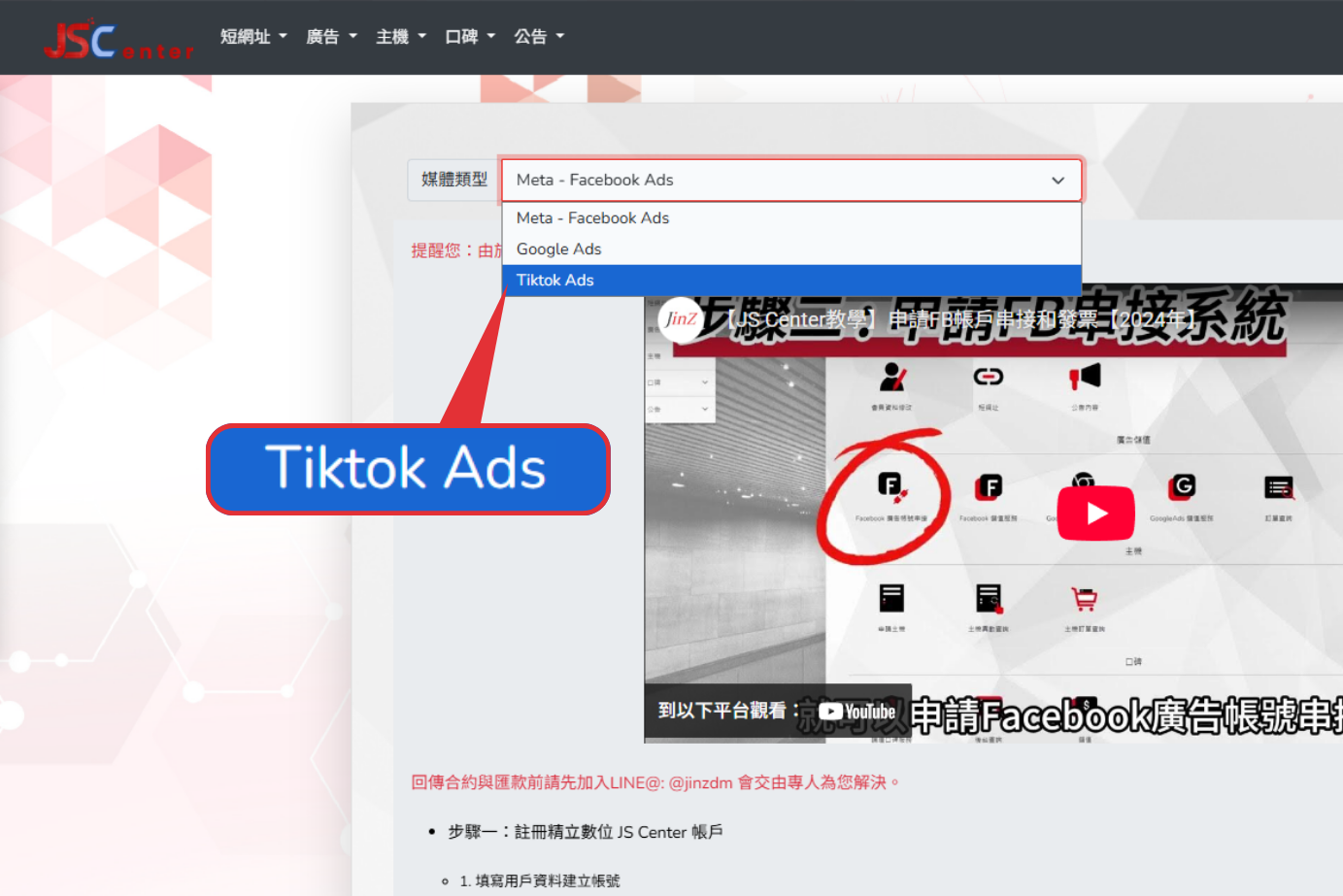 JS Center「TikTok 廣告帳號串接 / 儲值」功能,由精立數位協助企業完成廣告帳戶串接、費用儲值與發票開立,從資料提交、合約簽署到 24 小時內快速入帳,一站式完成廣告投放流程,解決金流卡住的問題。合法、安全、快速,讓企業廣告投放與財務管理更順暢無阻!