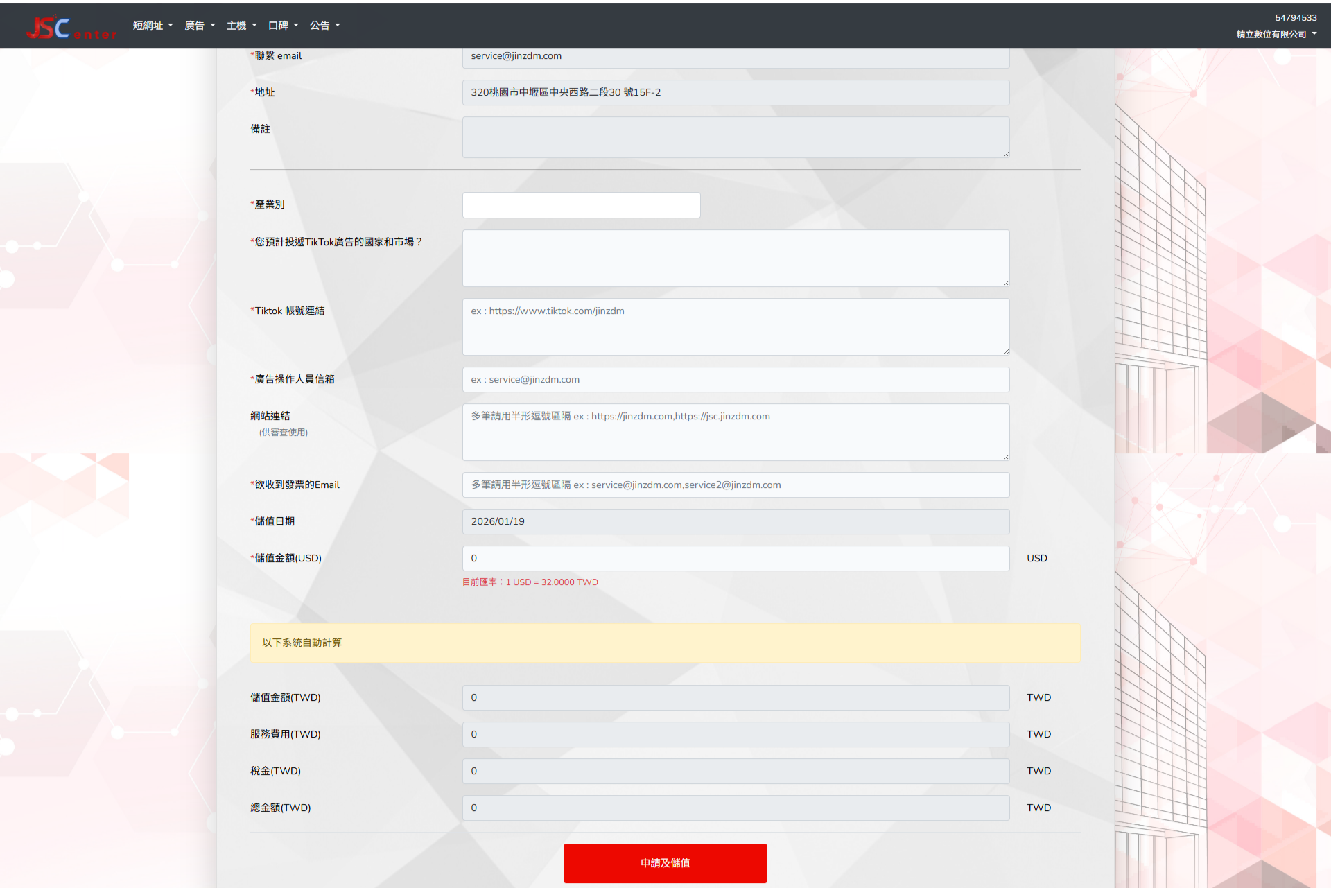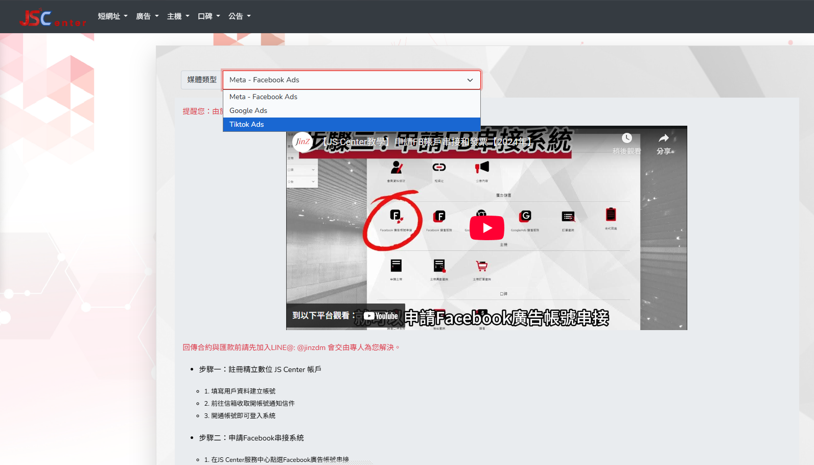 JS Center 系統導覽清晰,步驟簡單明確,無需繁瑣設定。只要填寫必要資料並完成審核,專員即協助完成帳號串接與儲值流程。24 小時內即可完成入帳與啟用,讓廣告主從資料提交到投放一氣呵成,節省時間與溝通成本,專注於行銷策略與創意執行。