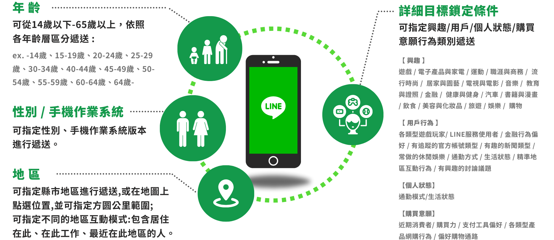 LINE 廣告提供的受眾設定方式多元,除了性別、年齡、地區、興趣外,還能鎖定 LINE 官方帳號好友類似受眾、在 LINE 上各種服務的行為等來做投放,幫助廣告主更精準鎖定到目標客群。