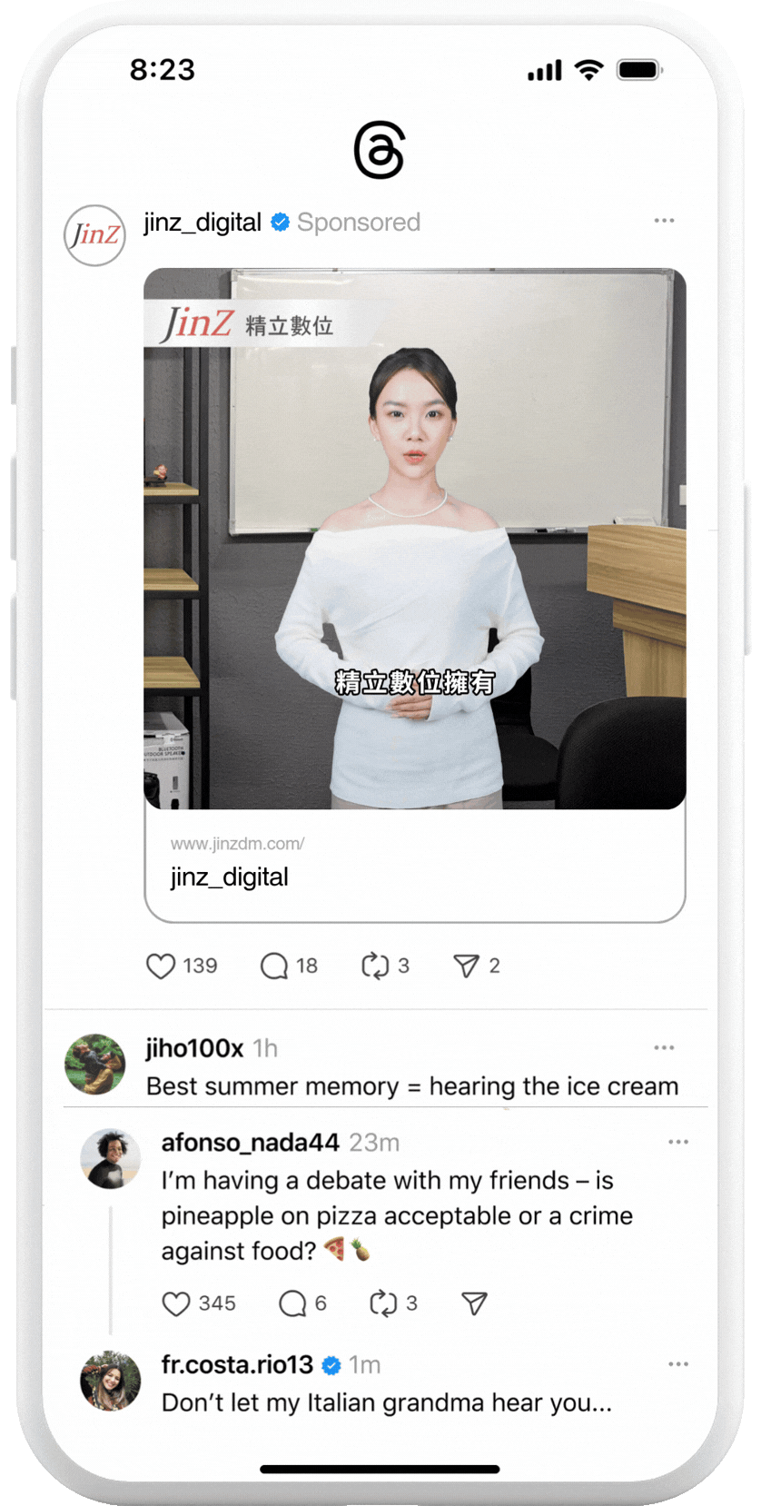 精立數位為您操作 Threads 廣告,您可以提供您的商品或服務,讓我們幫您設計廣告素材(選購),並設定至廣告系統,定期調整,以達到廣告最佳化。